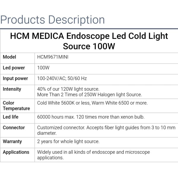 A premium medical-grade LED cold light source engineered for endoscopic and microscopic applications. The HCM MEDICA 100W model (HCM9671MINI) provides exceptional illumination, energy efficiency, and long operational life — ideal for ENT, laparoscopic, and general surgical use.