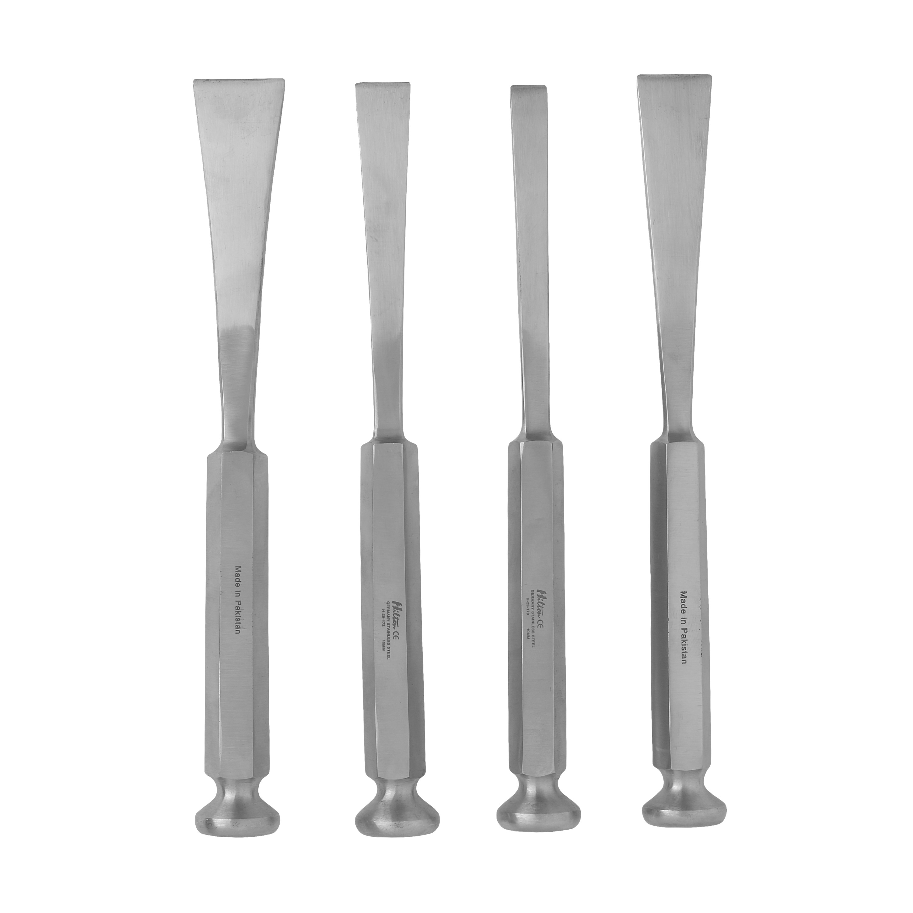 The Hilton Osteotome Set (4 Pieces) is a premium-grade surgical instrument set designed for cutting and shaping bone during surgical procedures. Each osteotome is precisely engineered with sharp blades and ergonomic handles to ensure accuracy and control. Ideal for orthopedic, ENT, and reconstructive surgeries.