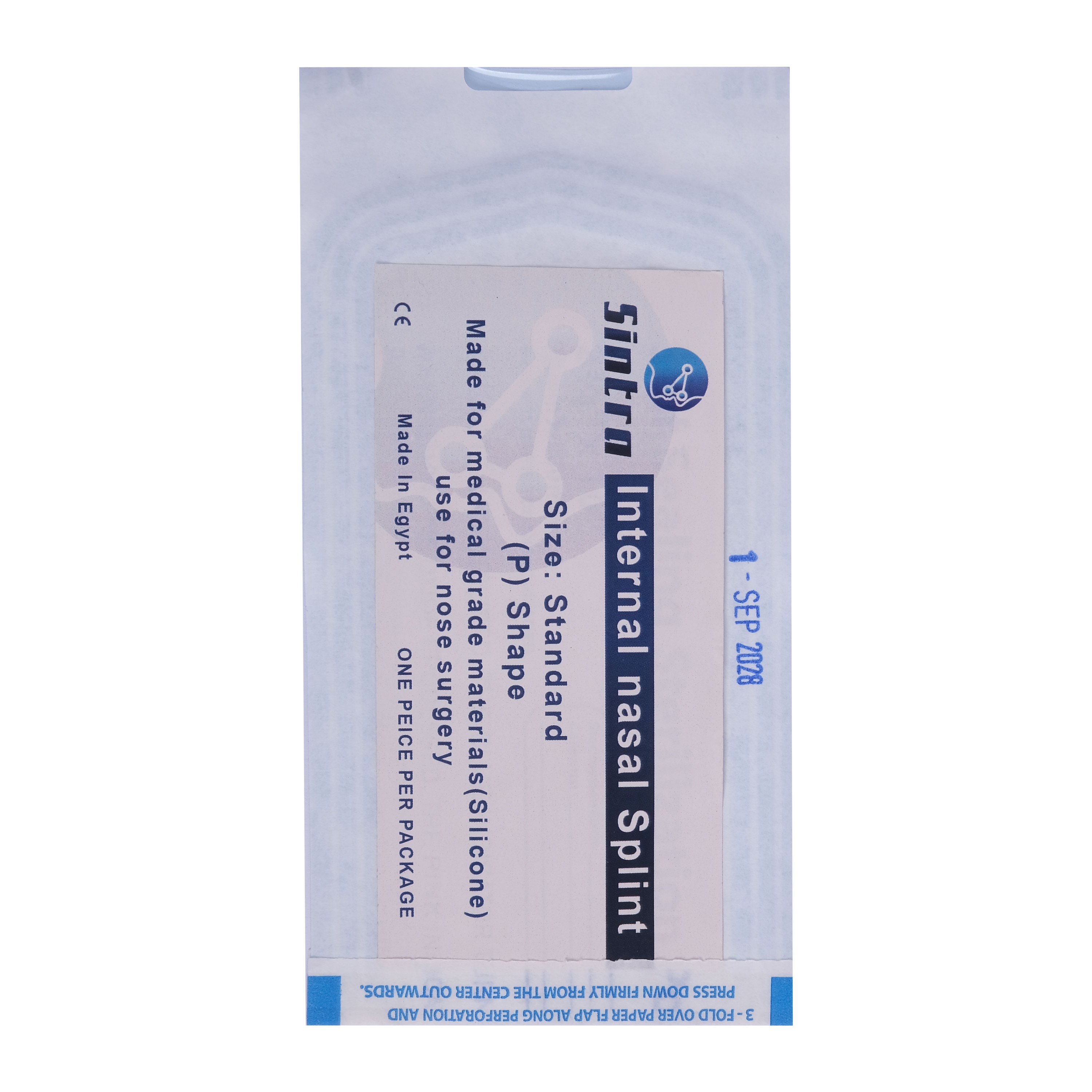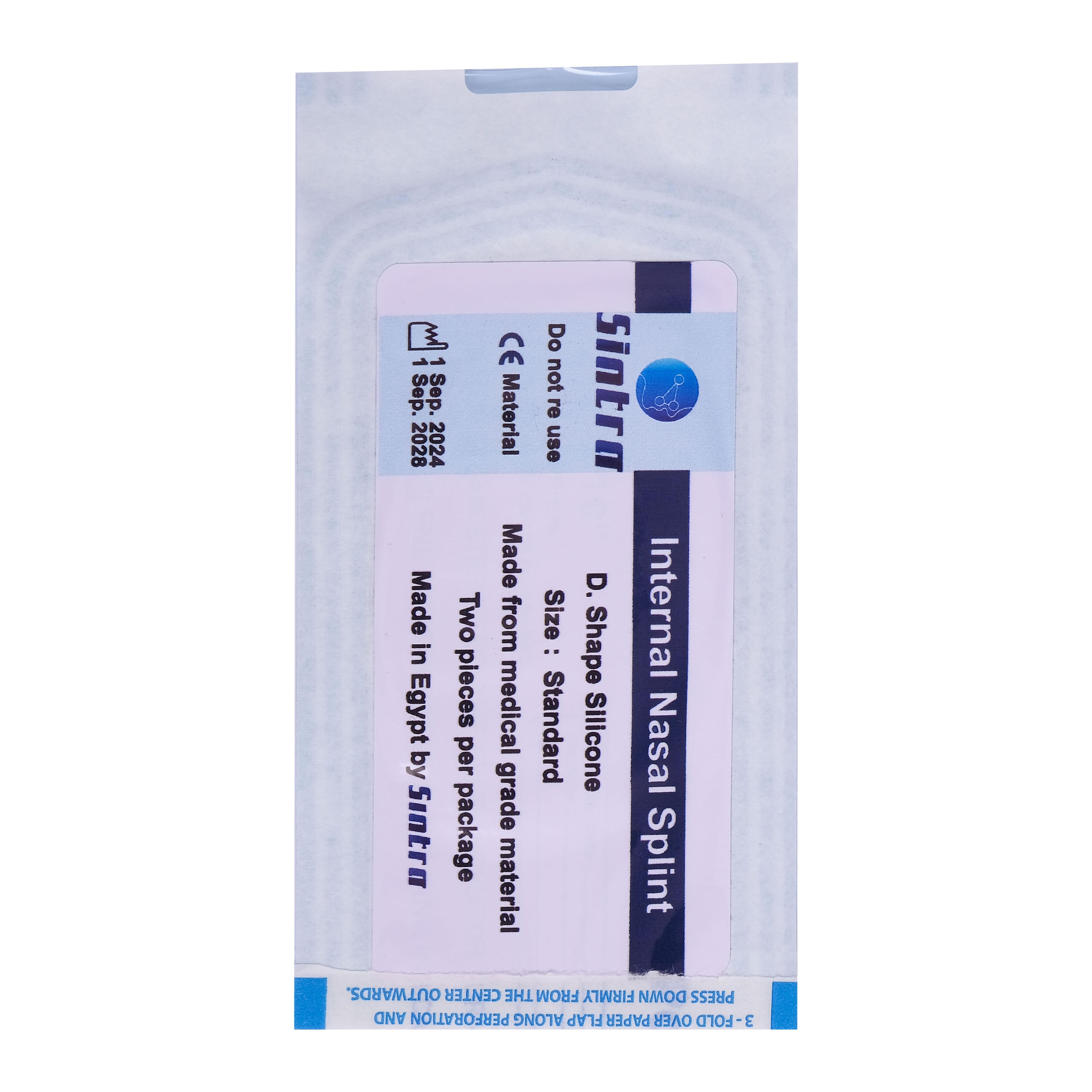Internal D&P-shaped nasal splint designed to maintain septal support after nasal surgery. Made of medical-grade material and supplied in sterile packaging. Two pieces per set