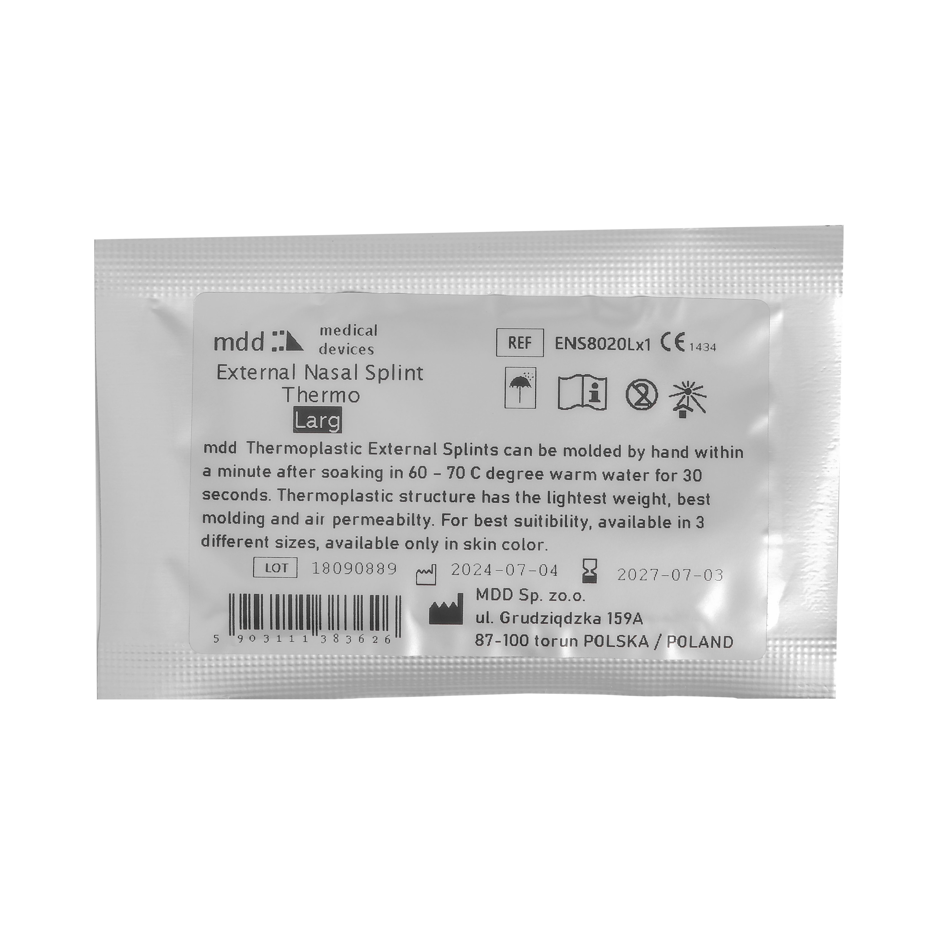 Lightweight thermoplastic external nasal splint designed for postoperative nasal support. Provides stability and protection during healing with customizable fit