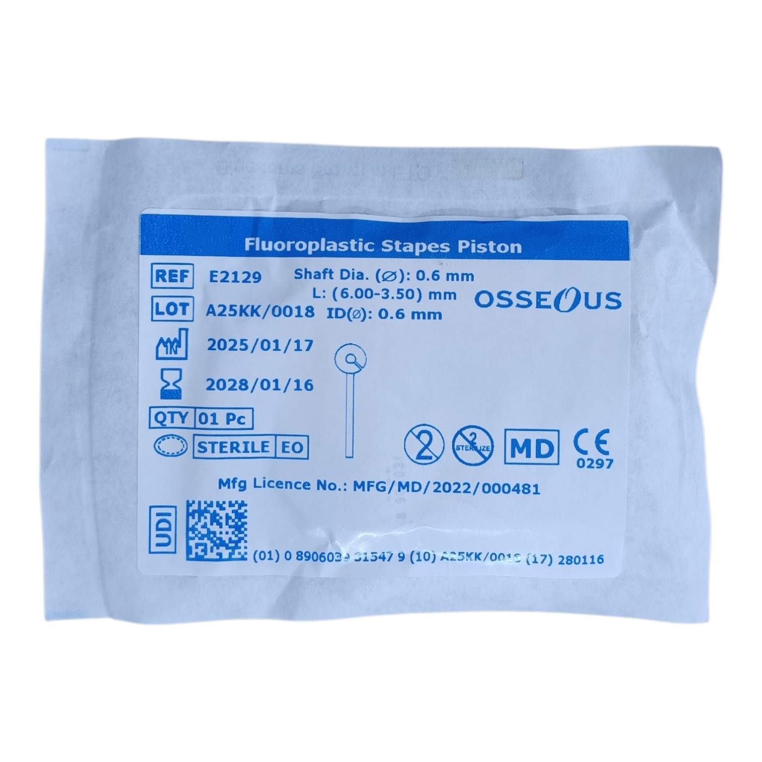 The Osseous PTFE Stapes Piston (4.50 mm) is a precision-engineered middle ear implant designed to restore hearing function in stapedectomy and stapedotomy procedures. Made from high-quality PTFE (Polytetrafluoroethylene), it ensures superior biocompatibility, minimal tissue reaction, and long-term stability. This implant delivers excellent sound transmission and secure placement within the ear structure.