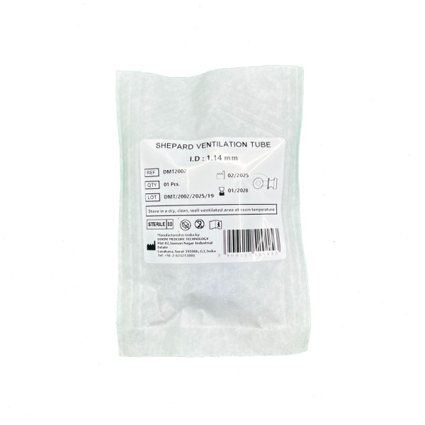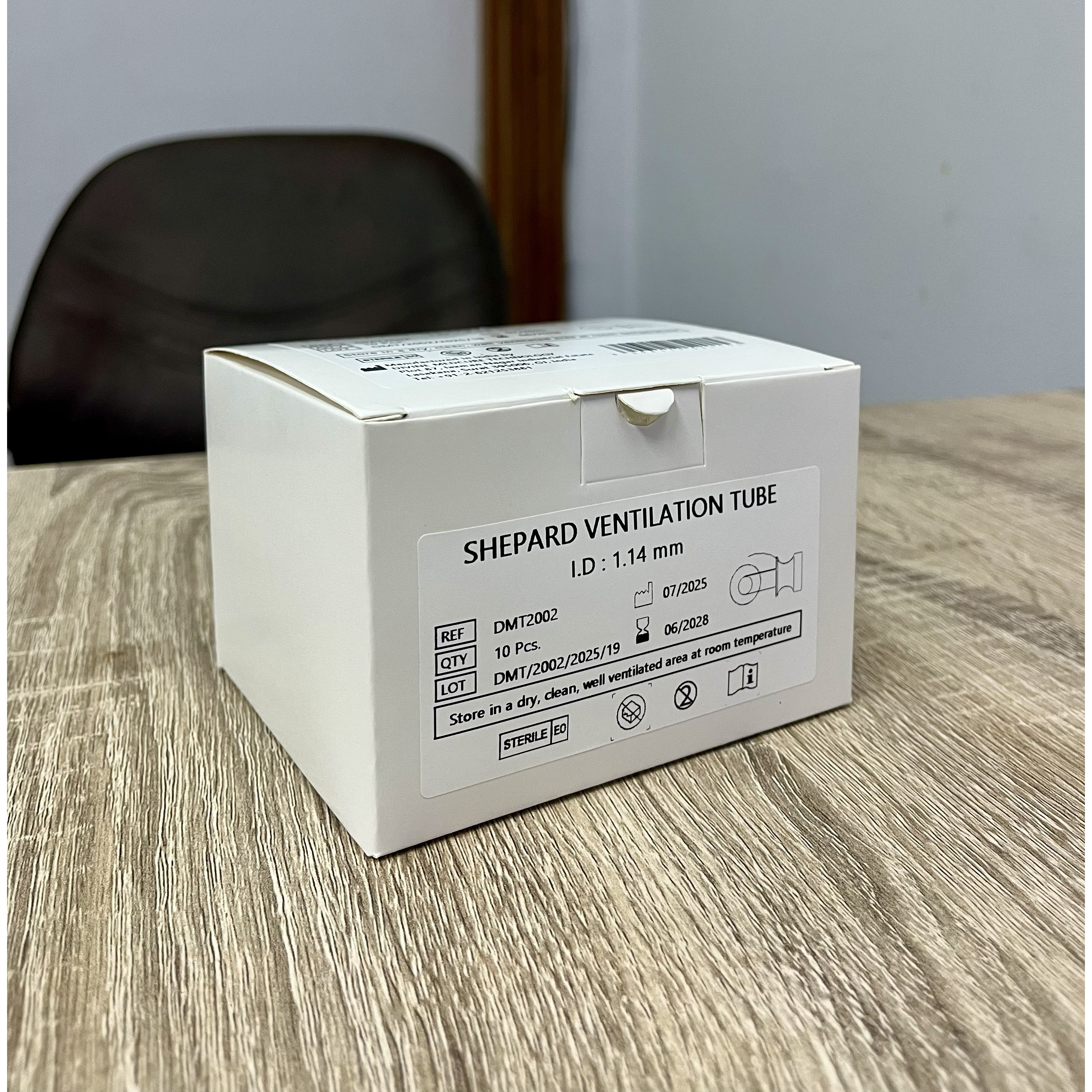 A medical-grade Shepard grommet tube with a built-in wire for enhanced stability and durability, designed to maintain middle ear ventilation. Each box contains 10 high-quality tubes suitable for ENT surgical procedures.